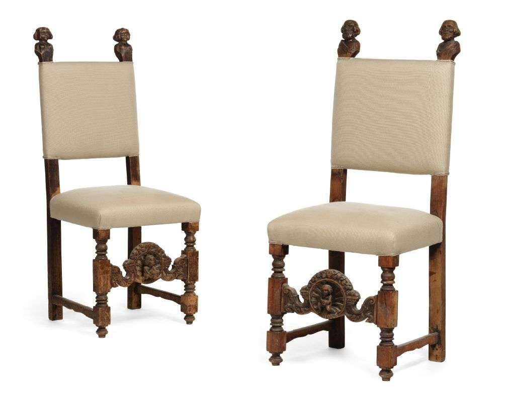 DEUX CHAISES en bois sculpté en pendants, le haut des montants ornés de bustes de femmes et d'hommes, la ceinture richement sculptée d'un enfant sur l'une et d'un vieillard sur l'autre dans un cartouche de fleurs et coquilles. Un vieil homme est représenté dans un cartouche entouré de fleurs