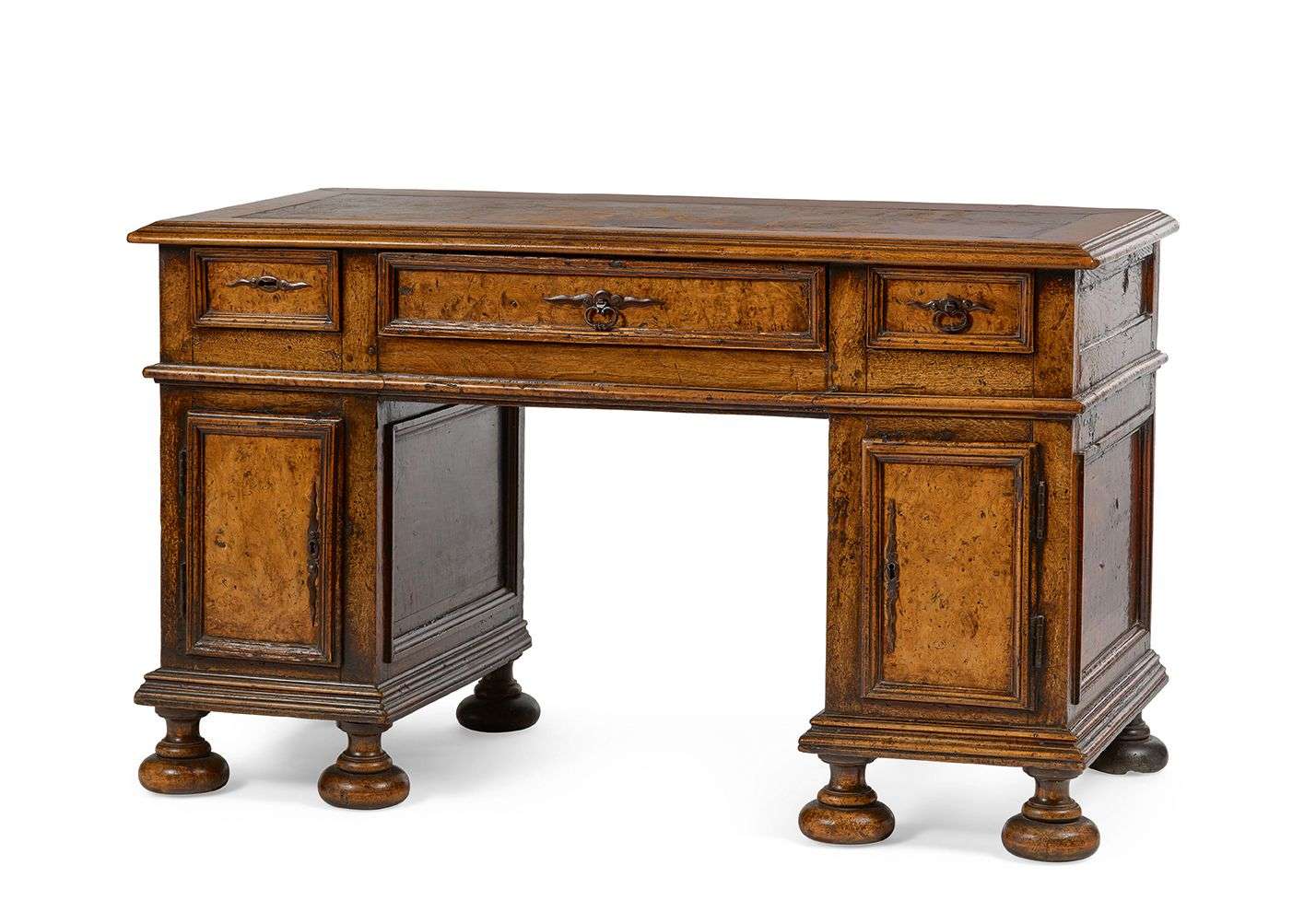BUREAU DIT «DE CHANGEUR» en noyer mouluré et sculpté. La ceinture ouvrant par trois tiroirs et les montants ouvrant chacun par un vantail côté travail. Repose sur huit pieds boules aplatis. France, XVIIe siècle.