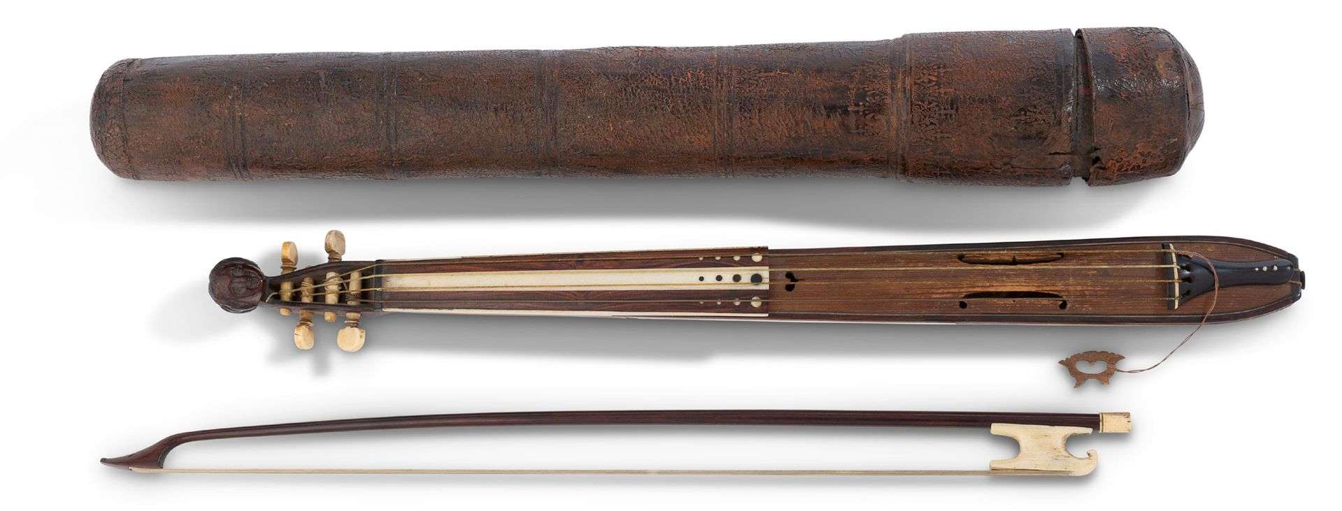 POCHETTE DE MAÎTRE À DANSER de forme oblongue en bateau. La table en épicéa d'une seule pièce convexe, non vernie. Ouïes en C adossés et surmontées d'un cœur percé. Manche et touche plaqués d'os et de palissandre à pastilles incrustées. Fond à cinq côtes en pans coupés à décor plaqué d'os et de palissandre alterné et pastilles incrustées. Chevillier en acajou sculpté à tête de femme. Quatre chevilles en os. Cordier et bouton d'ébène. Augsbourg, fin du XVIIe siècle. Attribuée à Thomas I Edlinger, vers 1670.