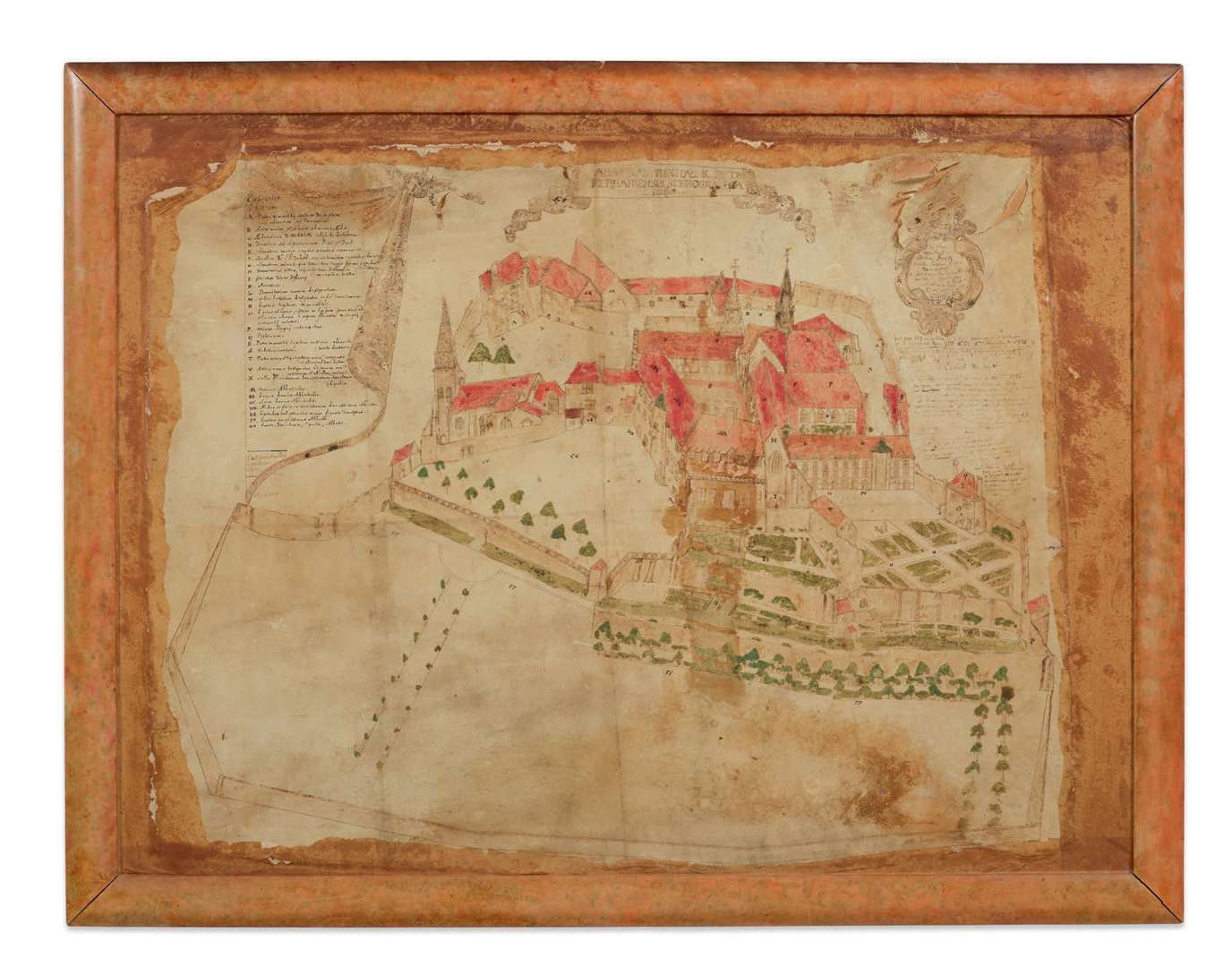 PLAN DE L'ABBAYE SAINT PIERRE DE FERRIÈRES à l'encre et réhauts de couleurs sur vélin. Plan dressé par « Rocheu arpenteur à Gien » de l'abbaye de Saint Pierre de Ferrières-en-Gâtinais (Loiret) en 1680. Cartouche supérieur : « Abbatiae Regiae S. Petri Ferariensis Scenographia ». Nombreuses indications. France, fin du XVIIe siècle.