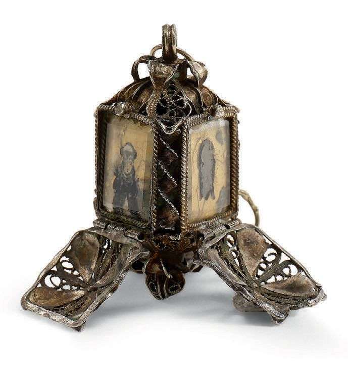 GRAIN DE DÉVOTION en filigrane d'argent et vermeil en forme de petite sphère à trois côtés à abattants ouvrant sur des plaques de verre églomisé représentant respectivement : les armoiries du Carmel, une Sainte Face et un Saint moine tonsuré. Dispose de sa chaînette d'origine. Espagne, XVIIe siècle.
