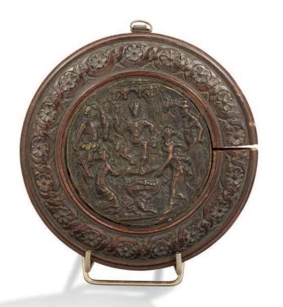 MÉDAILLE en bronze représentant le Jugement de Salomon dans un cadre en bois de Sainte-