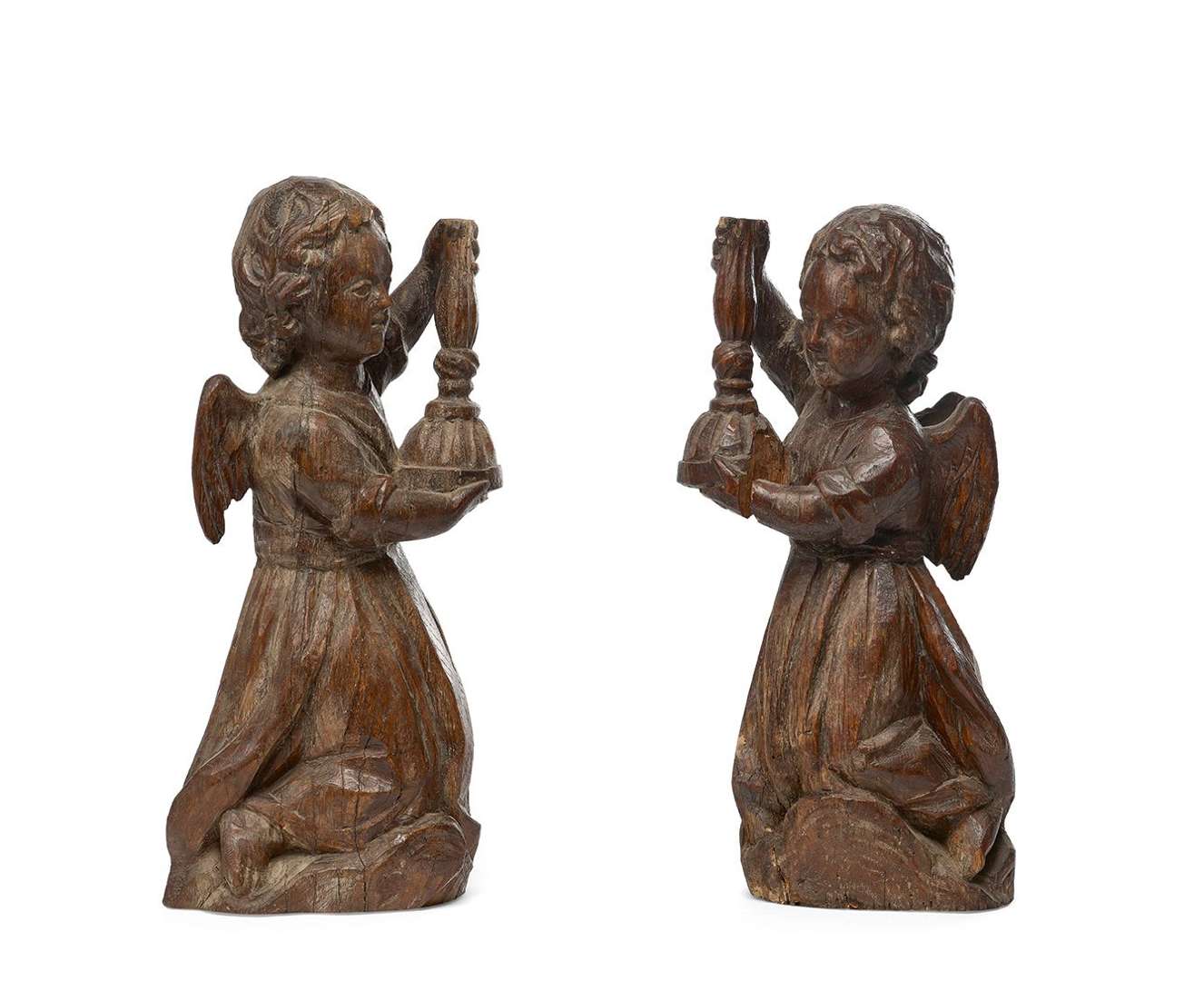 DEUX ANGES D'AUTEL CÉROFÉRAIRES en bois de chêne sculpté, ils sont agenouillés sur des nuées et tiennent des candélabres (percés pour acceuillir de petits cierges). Dos ébauchés. Début du XVIIe siècle.