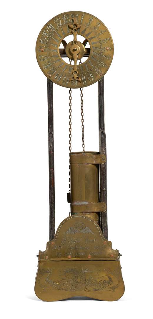 HORLOGE À EAU en cuivre et bois teinté noir. Le flotteur de laiton creux contenu dans un réservoir à eau de 59 heures, écoulement ajustable se deversant dans un cuve inférieure de laiton, amovible. Contrepoids en plomb. Cuve gravée de deux dauphins adossés. Plaque antérieure gravée : « J. Taylor fectif AD Salisbury 1692 / Use well youre houres ». Cadran à une aiguille, gravé des 24 heures. Angleterre, style du XVIIe siècle.