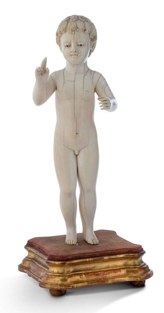 Statuette en ivoire sculpté représentant l'Enfant Jésus se tenant debout, nu, tenant de sa main gauche une croix (disparue), le bras droit bénissant. Trou supérieur de fixation de l'auréole (manquante). Cheveux finement sculpté, les yeux et des traces de stigmates aux mains et pieds polychromés. Inde portugaise, Goa, XVIIIe siècle.
