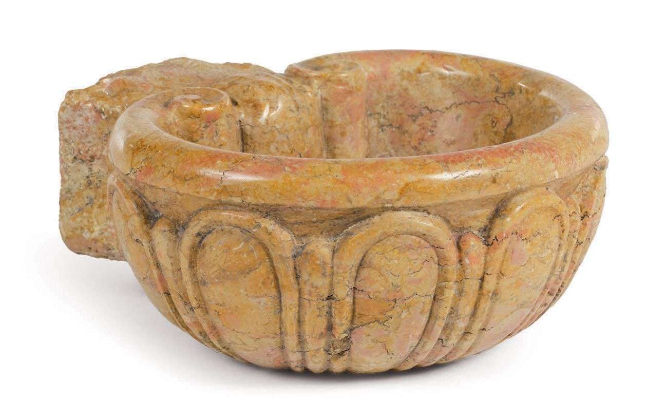 BÉNITIER en marbre Nembro Rosato sculpté en forme de petit rognon, la panse sculptée de godrons. Avec son tenon taillé dans la masse. Italie, Sienne, XVIIIe siècle.