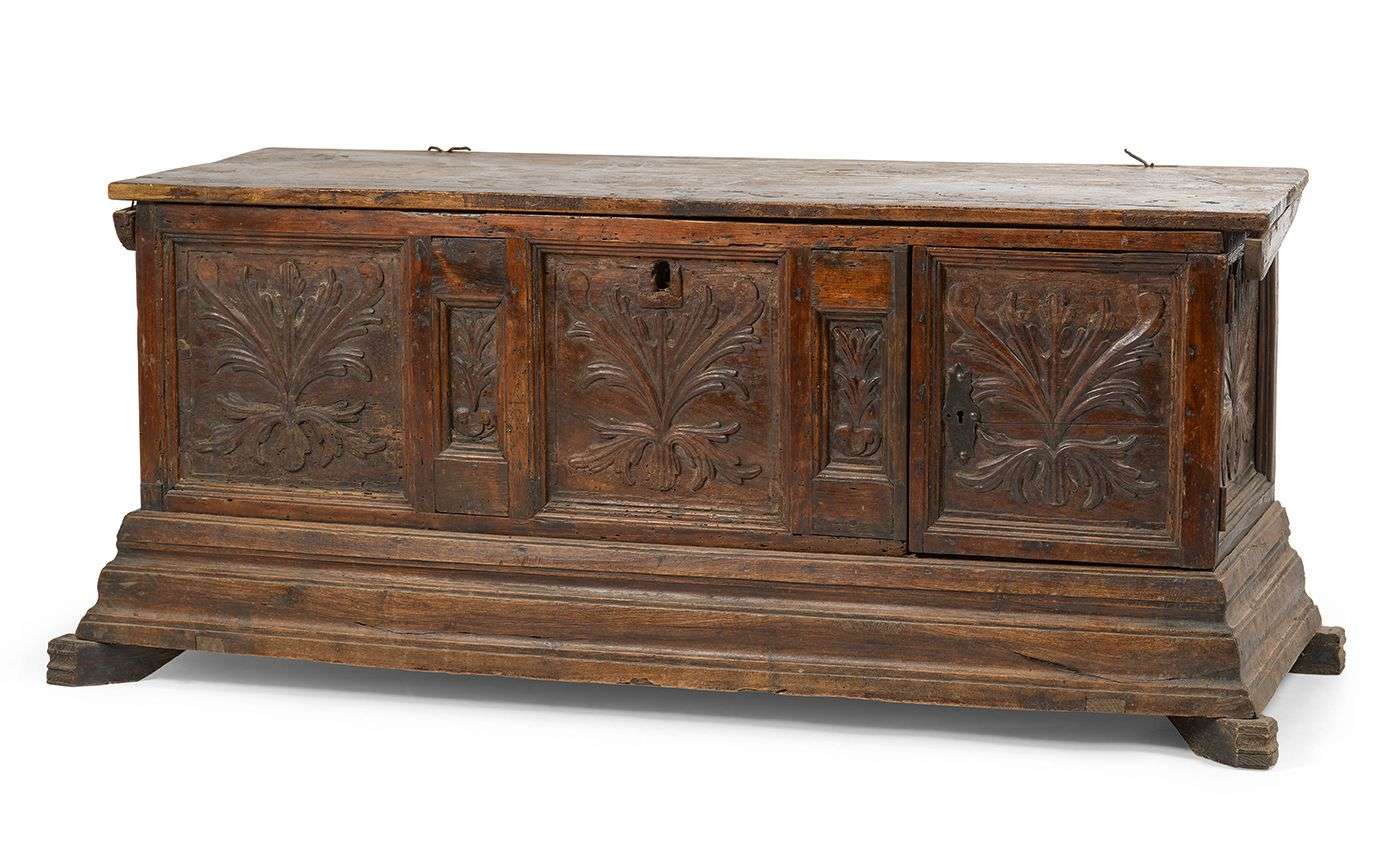 COFFRE À VANTAIL en bois sculpté sur les trois faces de panneaux de lambre