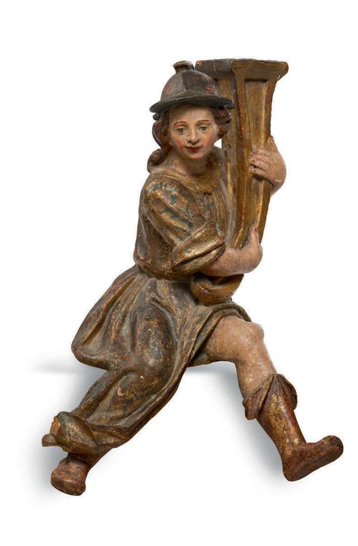 DEUX PERSONNAGES CÉROFÉRAIRES en bois sculpté et peint polychrome. Ils sont vêtus à l'antique et se tiennent assis en pendant. Têtes casquées et pieds chaussés de bottes, une jambe ballante, ils tiennent des cornes d'abondance dorées percées pour recevoir les bougies. Début du XVIIIe siècle.
