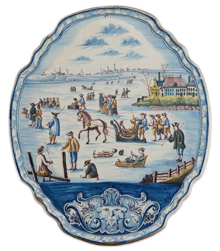 Lot de deux grandes plaques murales en faïence à bord contourné, les décors polychromes de paysages d'hiver avec nombreux patineurs et traineaux. Cartouche rocaille en camaïeu bleu dans la partie inférieure. Datées respectivement au revers : 1763 et 1773. Probablement Delft, XVIIIe siècle.