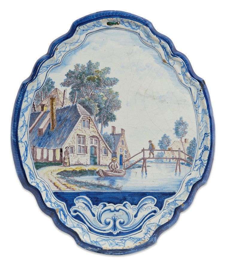 Lot de deux plaques murales en faïence à bord contourné, les deux aux mêmes décors polychromes de maisons en bord de canal, un homme sur une barque et voyageur sur un pont. Cartouches rocailles en camaïeu bleu dans la partie inférieure. Signés au dos en bleu. Probablement Delft, XVIIIe siècle.