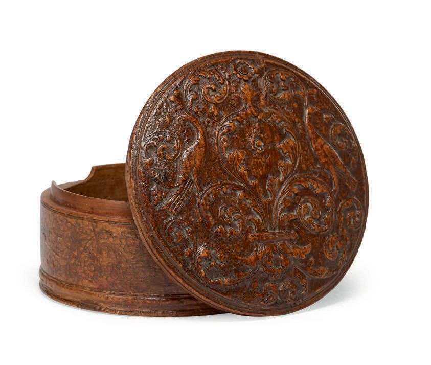 BOÎTE CIRCULAIRE en bois de Sainte Lucie tourné et sculpté, les parois à décor gravé d'un coeur enflammé entouré de rinceaux à fleurettes, le couvercle à décor sculpté en bas relief d'une grande fleur de lys accompagnée de deux oiseaux affrontés dans un entourage de rinceaux feuillagés. France, XVIIIe siècle.