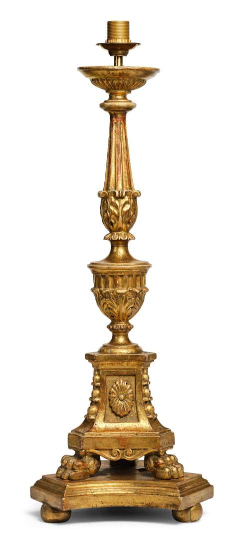 PIQUE-CIERGE D'AUTEL en bois sculpté et doré. Le fût cannelé à décor de feuilles d'acanthe, il repose sur un piètement balustre tripode terminé par des pattes de lion. L'arrière non sculpté et non doré. Fin du XVIIIe siècle. Sur un socle en bois doré reposant sur des boules écrasées.