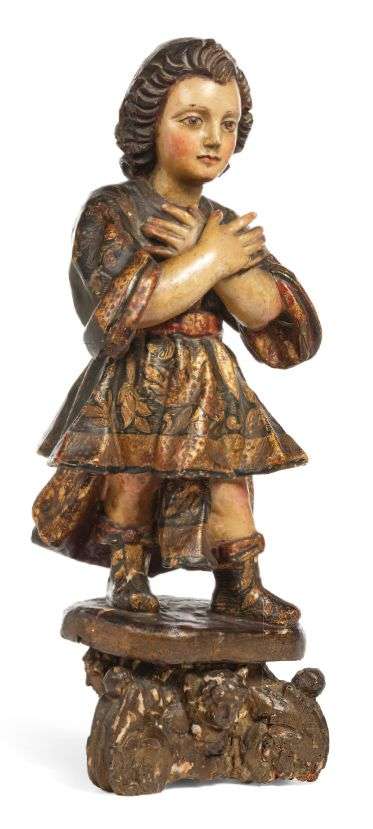 SAINT ANGE ADORATEUR en bois sculpté et peint polychrome, les bras croisés sur la poitrine.
