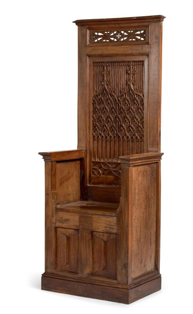CATHÈDRE en chêne sculpté, le dossier haut caractéristique à riche panneau de fenestrages à orbevoies surmonté d'un rectangle à clairvoie (rapporté). L'assise formant coffre. France, en partie du XVe siècle.