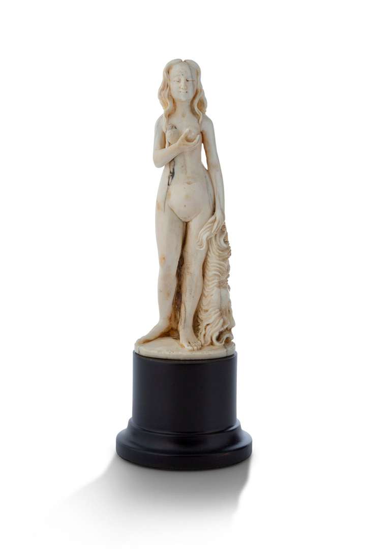 ~ STATUETTE en ivoire sculpté représentant une femme se tenant debout, nue, pressant son sein gauche avec sa main droite. De sa main gauche elle traine une tête de géant barbu placée sur son côté. Style du XVIe siècle.