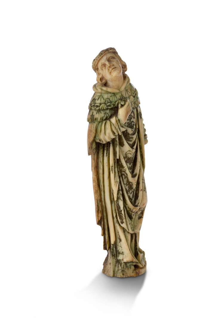 Petit sujet en ivoire sculpté, il se tient tel Saint Jean au pied de la Croix, debout, la main droite sur le coeur, le regard tourné vers le Ciel. Il porte une couronne ainsi que le collier de Saint Michel sur une capeline d'hermine et revêt un grand manteau fleurdelysé. France, XIXe siècle.