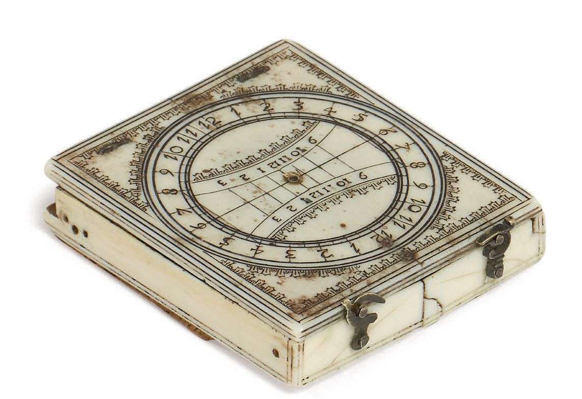 ~ CADRAN SOLAIRE en ivoire à fil, boîtier carré présentant une boussole horizontale à fond de laiton gravé et un disque (volvelle lunaire manquante). L'avers du couvercle gravé d'un troisième cadran à index en chiffres arabes. Dieppe, début du XVIIIe siècle.