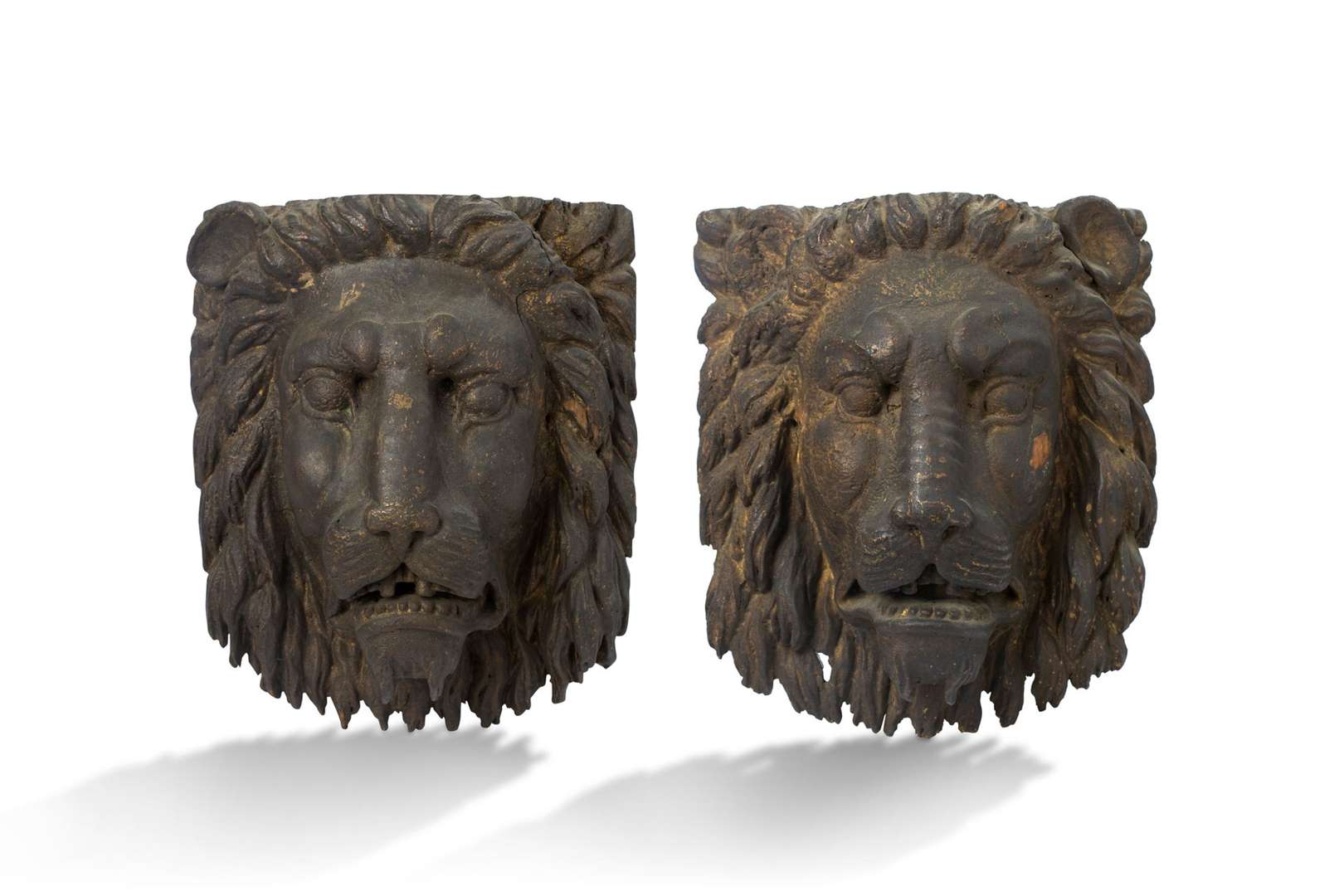 Paire de mantelets de sabord figurant des mufles de lions en bois sculpté noirci.