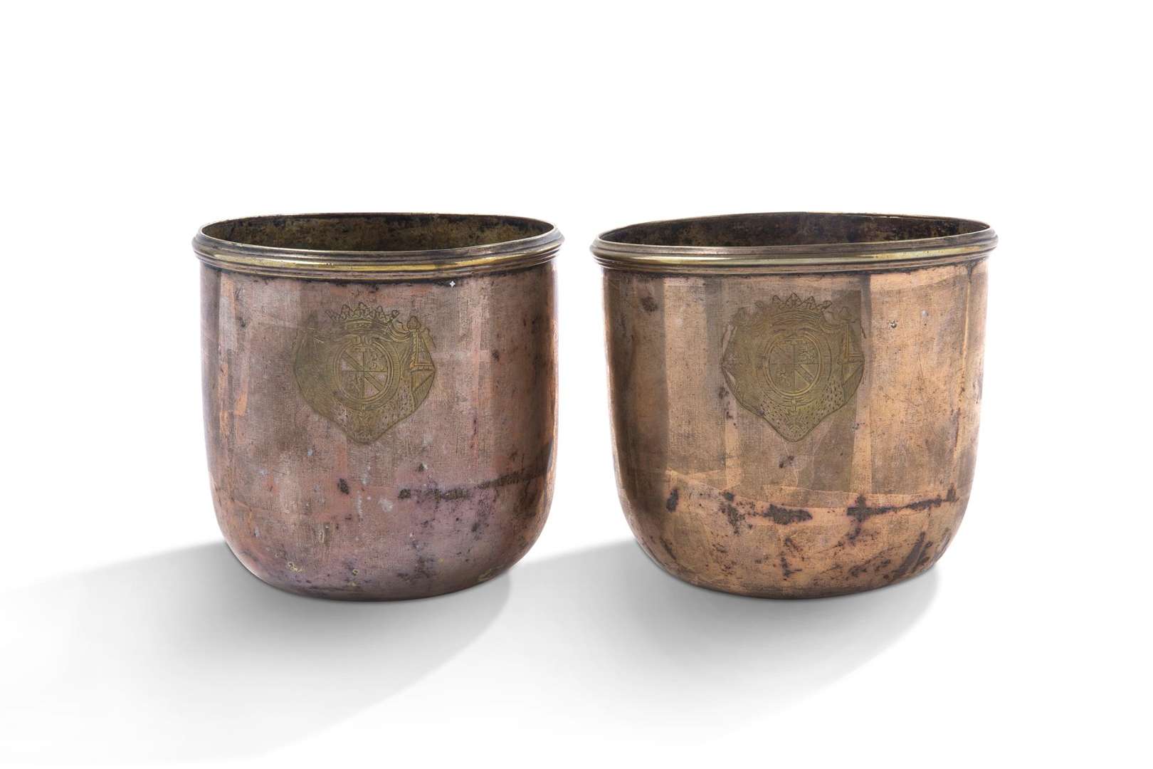 Paire de rafraichissoirs en métal doublé, forme cul rond, bordure moulurée, la panse à décor gravé d'armoiries écartelées aux un et quatre d'argent à une bande d'azure de l'un en l'autre (Durfort), aux deux et trois de gueules au lion d'argent, brisé le tout d'un lambel d'argent, armes de la famille de Durfort de Lorge. Le tout sommé d'une couronne ducale et pourvu d'une médaille de chevalier de l'Ordre du Saint-Esprit.