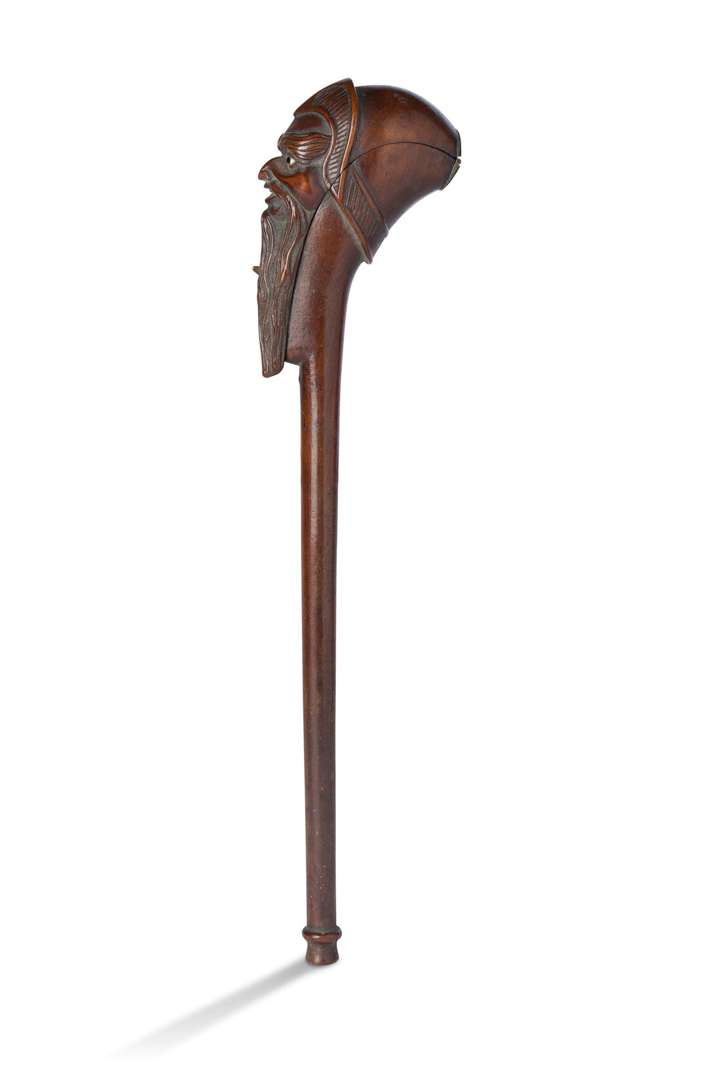 Étui pour pipe en terre en buis sculpté, la tête amovible en forme de visage de vieillard barbu, les yeux en verre incrustés.