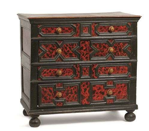 Commode de forme rectangulaire en bois sculpté noirci et peint à l'imitation de l'écaille ouvrant à cinq tiroirs sur quatre rangs à encadrements moulurés, pieds en boules aplaties, poignées en bois tourné doré.