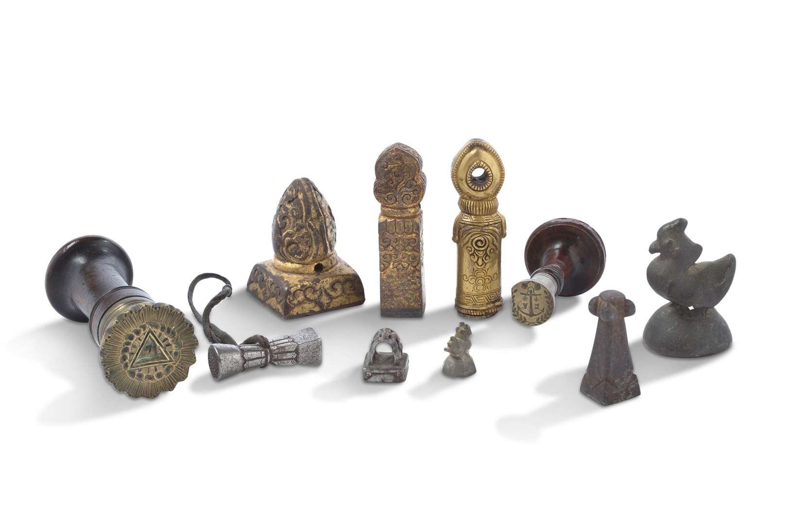 Ensemble de cachets en bronze bois et laiton sur le thème de la marine, franc-maçonnerie et Chine.