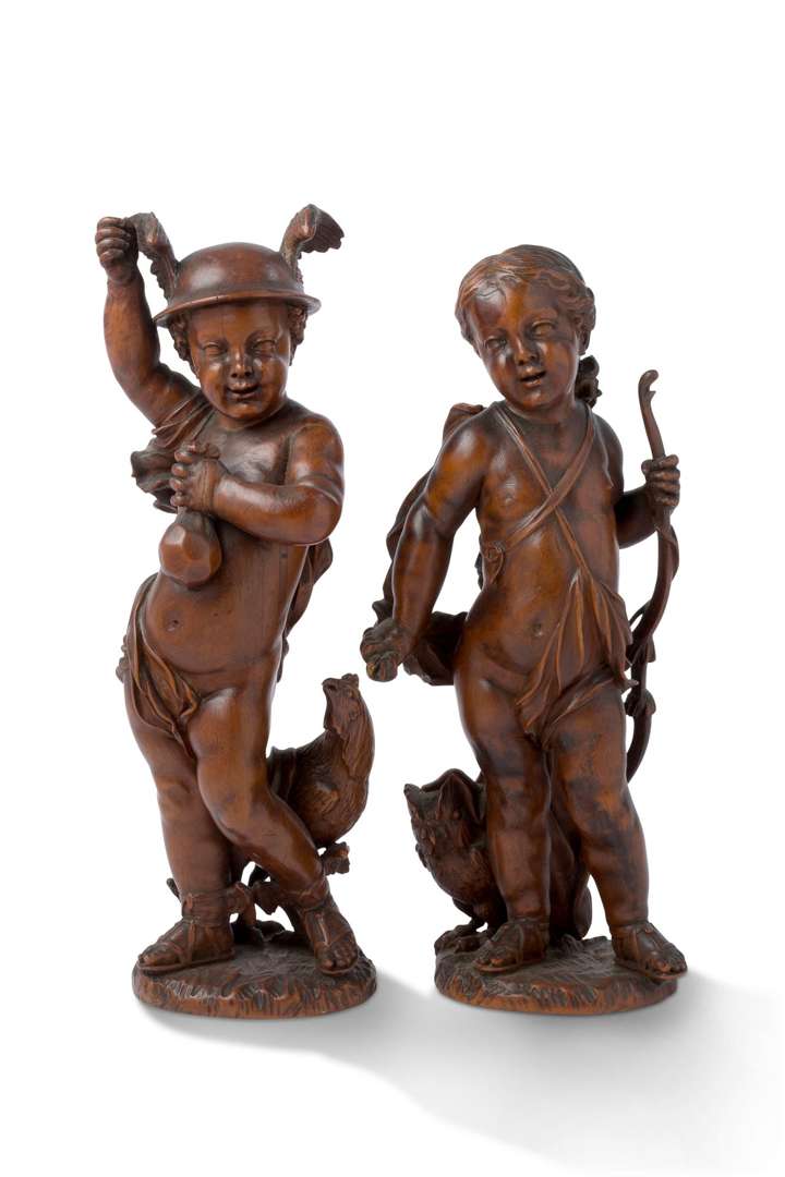 Mercure et Minerve enfants deux sculptures en pendants en bois fruitier finement sculpté. Mercure, debout sur une terrasse, tenant une bourse, un coq à ses pieds et