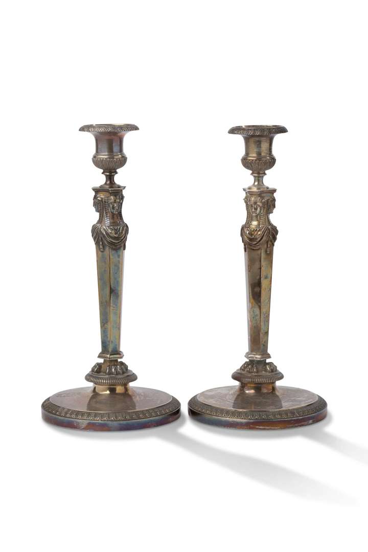 Paire de flambeaux en argent le fût à pans à décor de têtes de sphinges, l