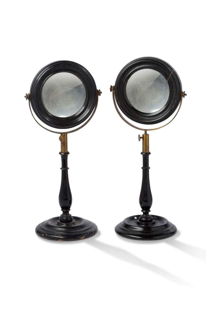 Paire de miroirs sur pieds ajustables en bois noirci et laiton, fût balustre et base circulaire.