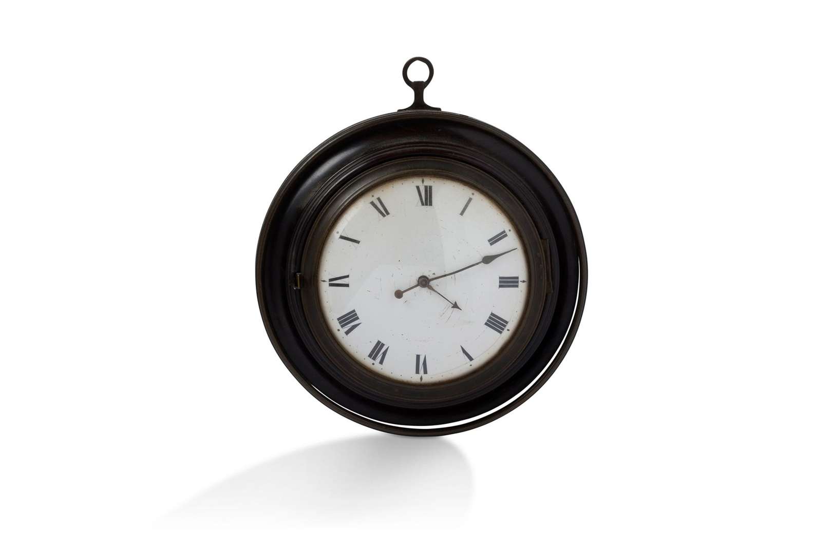 Le cadran émaillé présentant les heures en chiffres romains, le cadre circulaire en bois et laiton.