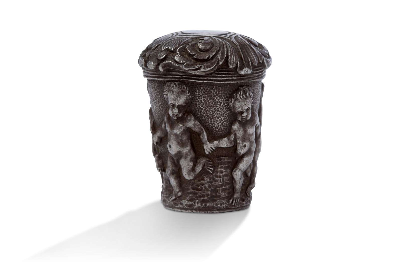 Pommeau de canne en bronze argenté à décor sculpté d'une ronde de putti sur fond amati, le dessus orné de rinceaux.