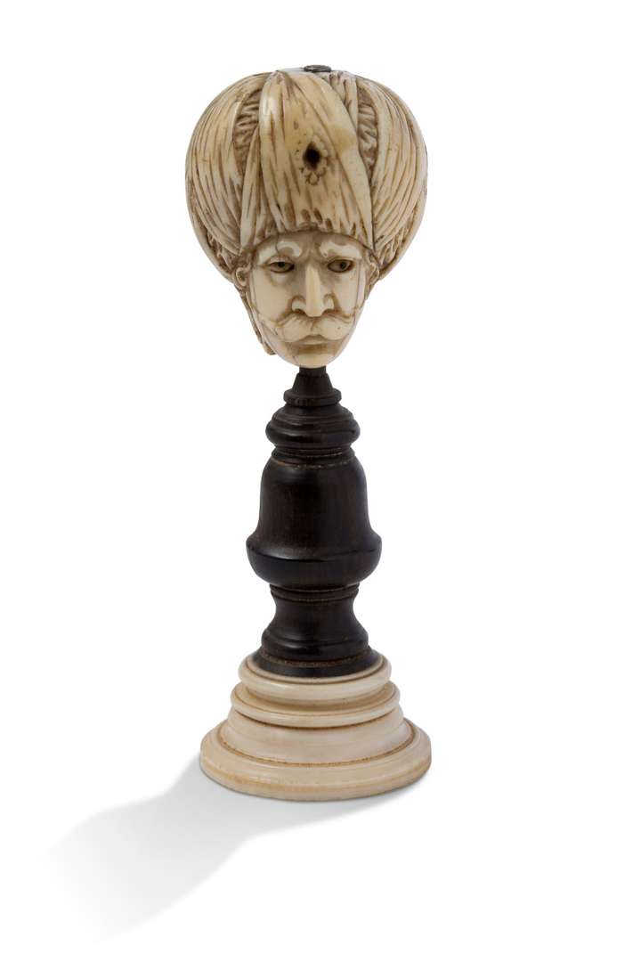 ~ Pommeau de poignard figurant Soliman le Magnifique en ivoire sculpté, monté sur pied en bois tourné.