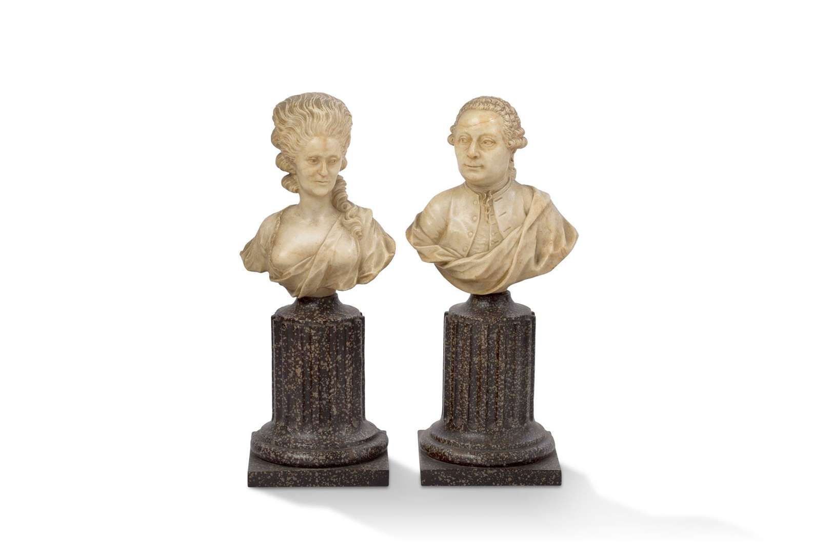 Paire de bustes en marbre figurant Marie-Antoinette et Louis XVI, sur un piédestal cannelé en bois peint à l'imitation du marbre.