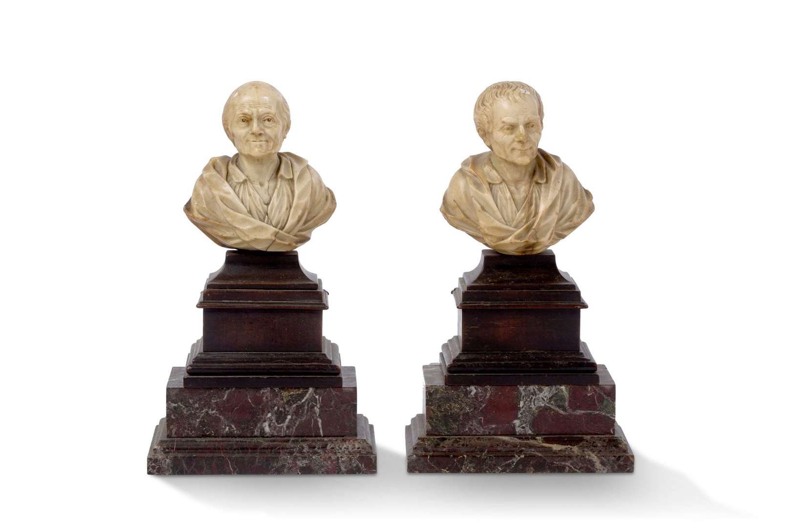 Paire de bustes en marbre sculpté figurant Voltaire et Rousseau drapés d'a