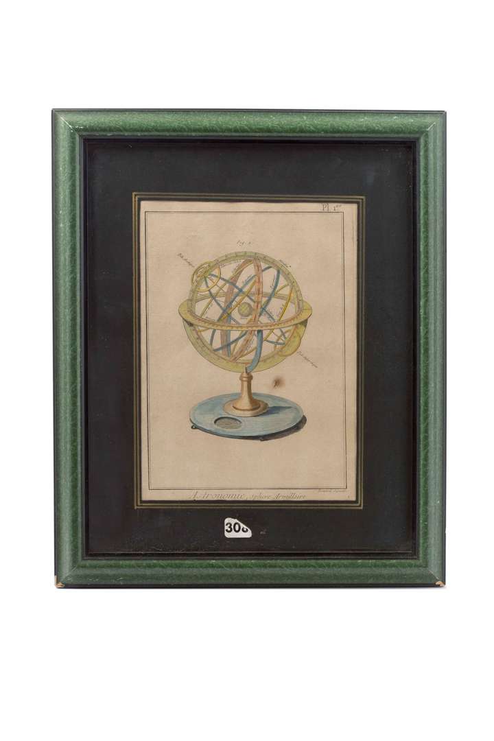 Suite de deux gravures anciennes au burin réhaussées en couleurs à l'aquarelle, l'une figurant une sphère armilliaire et l'autre sur papier vergé figurant un anneau astronomique équinoxial.
