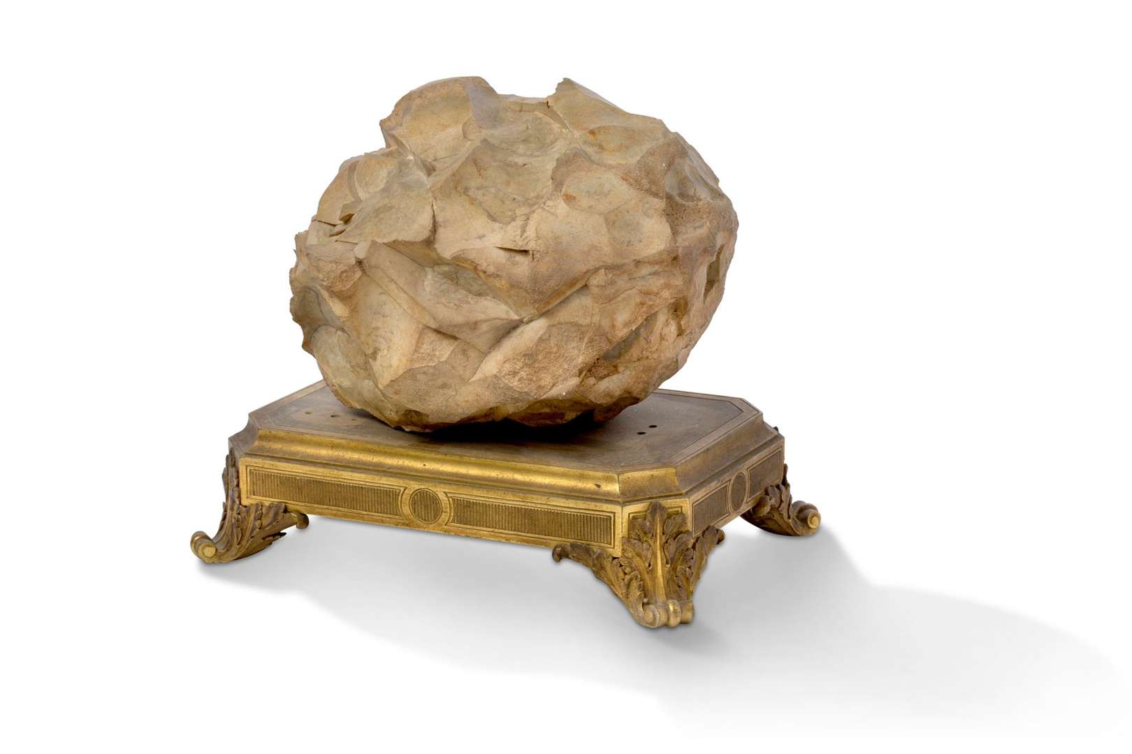 Sur un socle en bronze doré de style Louis XV, les pieds à enroulements et feuilles d'acanthes, signé G. MANNIER 1895.
