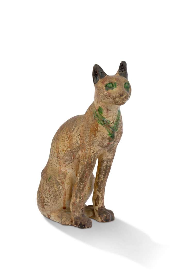 Chat assis en terre vernissée à glaçure beige et verte.