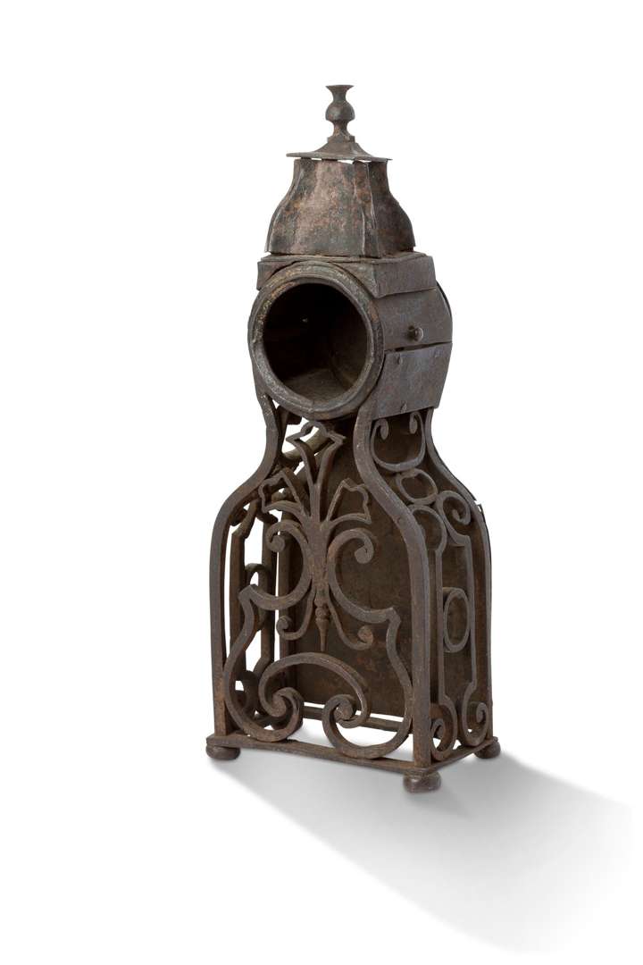 Porte-montre en fer forgé à décor ajouré de fleurs de lys et enroulements.