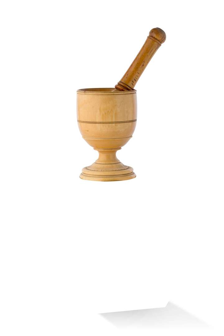 ~ Mortier et son pilon en ivoire tourné annelé.