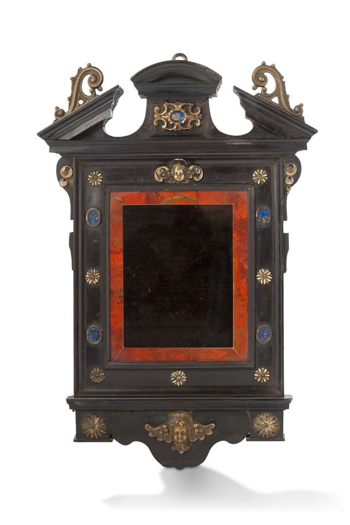 Cadre architecturé à fronton en bois sculpté, mouluré et noirci à décor de têtes de putti ailées et fleurettes en bronze doré alternées de médaillons en lapis-lazuli.
