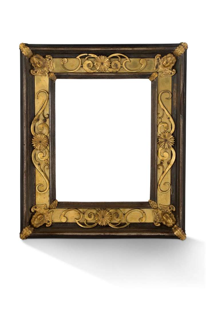 Petit cadre en bois mouluré noirci et bronze doré en applique à décor de rinceaux, volutes et têtes de putti ailées aux écoinçons.