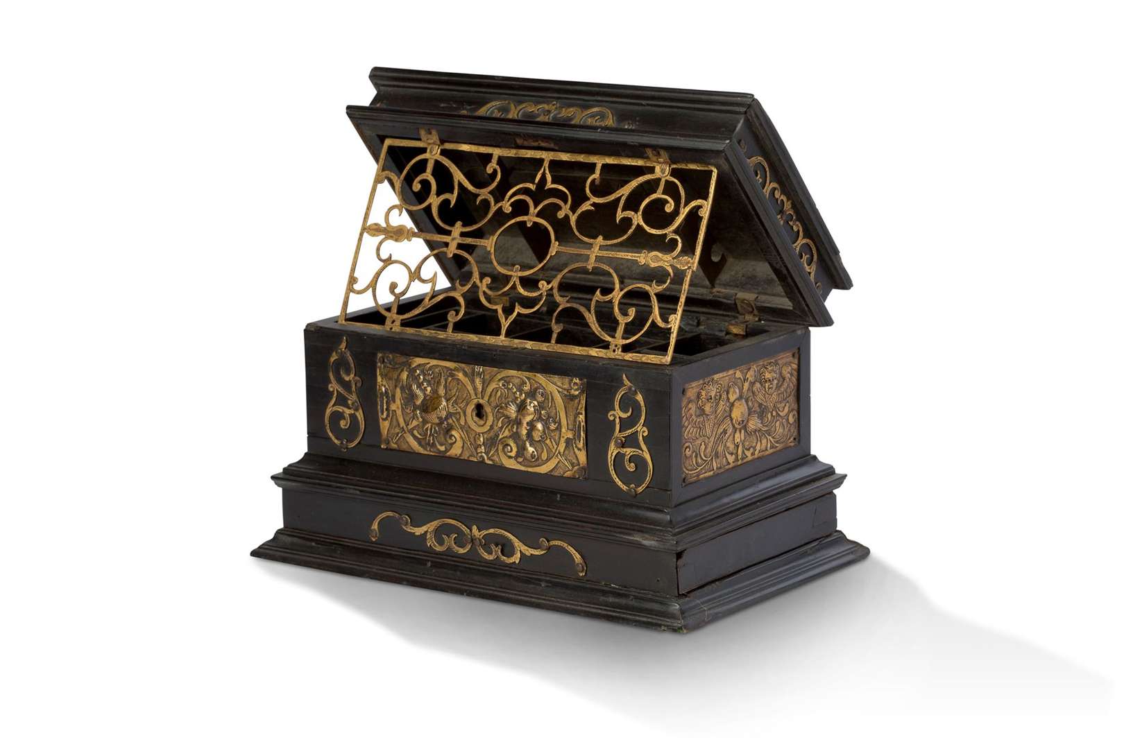 Nécessaire à secret rectangulaire, le dessus en doucine. Il est en placage d'ébène mouluré. Chaque face offre une plaque de cuivre dorée travaillée au repoussé et ciselée à décor de têtes d'anges ailées, fruits et rinceaux. Il ouvre à un abattant supérieur découvrant un intérieur compartimenté mobile comprenant un dévidoir à ruban. Un tiroir secret latéral. Le dessous de l'abattant est de cuivre repercé, gravé et doré, ouvrant sur deux barres de laiton permettant le rangement d'outils perdus et sur une targette actionnant une autre ouverture secrète sur le dessus (non fonctionnelle).