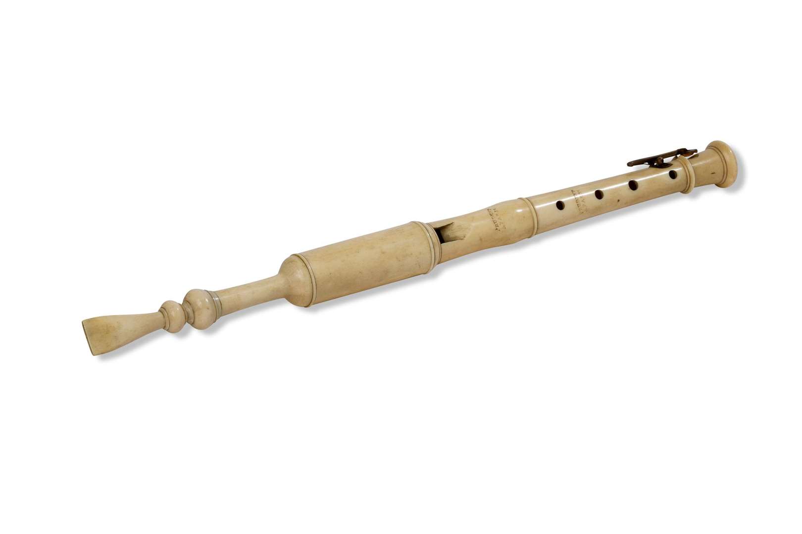 ~ Flageolet en ivoire tourné et sculpté, clef en métal, estampillé «PRUDENT à PARIS».