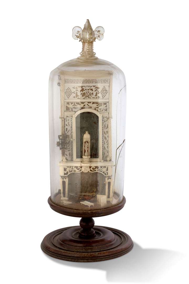 ~ Âtre miniature composé d'une cheminée, d'un miroir de cheminée et d'un nécessaire de foyer en ivoire sculpté.