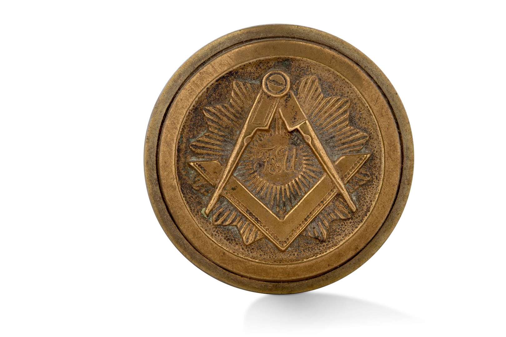 Bouton maçonnique en bronze orné du compas et de l'équerre centrés de l'inscription «F&U».