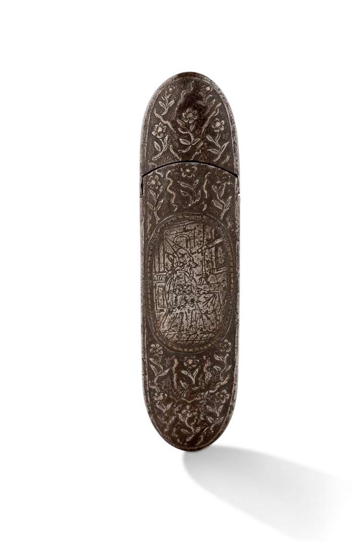 Étui à lunettes de forme navette, en fer à décor au repoussé d'un jardin fleuri centré d'un médaillon ovale figurant