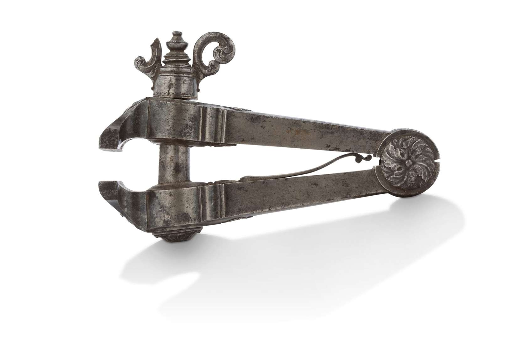 Étau à main en fer forgé et sculpté de feuilles d'acanthes, volutes et fle