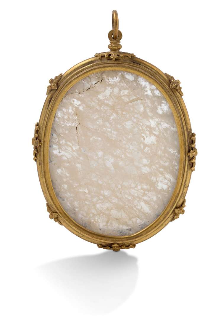 Deux plaques de quartz givré l'une ovale dans un cadre en bronze ciselé doré à anneau de suspente, l'autre dans un cadre en métal doré à arcature en plein cintre.