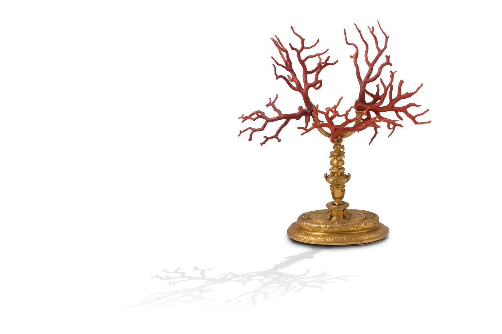 ~ Corail monté à cinq branches en corail rouge méditerranéen (corallium rubrum) assemblées pour en former trois. Les trois branches montées sur un pied de cuivre doré en fer à cheval sur un fût richement décoré de têtes d'anges ailées. La base ovale incisée et gravée de cuirs découpés sur fond amati.
