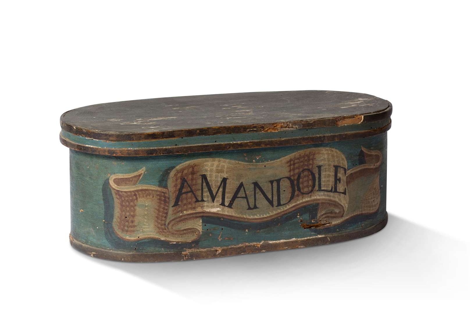 Boîte ovale en bois peint polychrome portant l'inscription «Amandole».